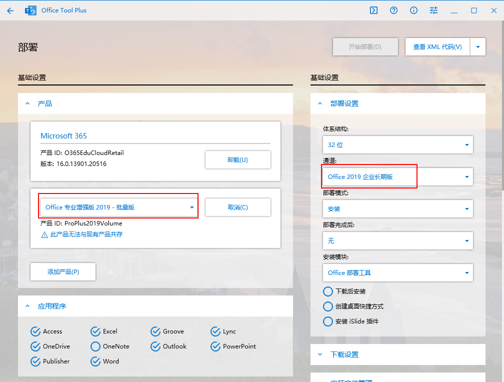 一劳永逸的方法,就是重新安装Office,以微软正规的方式安装。Office 2019微软没有提供批量版本的镜像下载,可使用前期文章中推荐的Office管理工具Office Tool Plus进行安装。