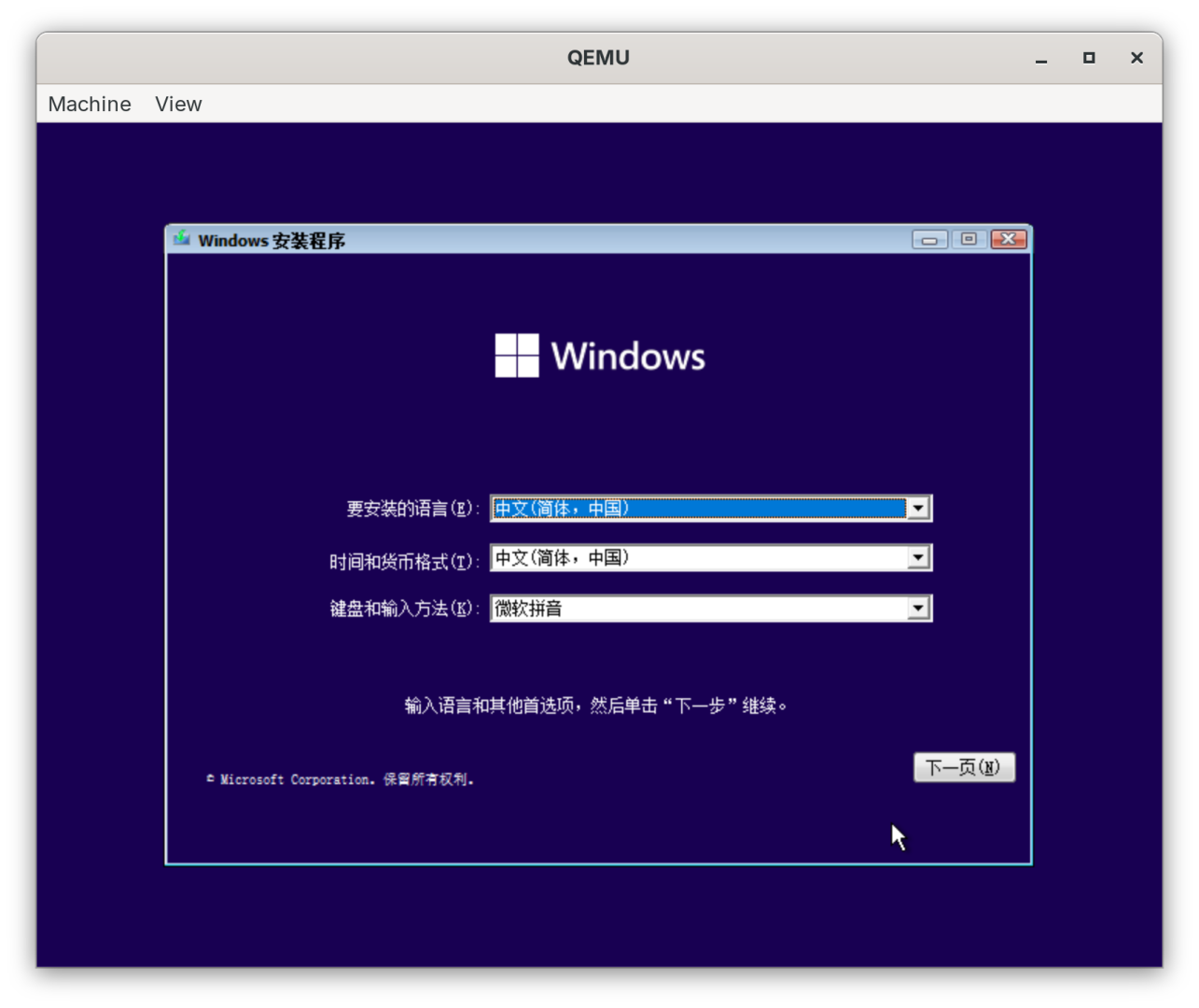 - qemu-system-aarch64 -machine virt,virtualization=on -cpu max -smp 4 -m 4G -drive if=pflash,format=raw,readonly=on,file=edk2-aarch64-code.fd -drive if=pflash,format=raw,file=QEMU_VARS.fd -device ramfb -device nec-usb-xhci -device usb-kbd -device usb-tablet -device usb-storage,drive=cdrom1,bootindex=1 -drive id=cdrom1,if=none,media=cdrom,format=raw,file=BOOT_ArmPE_22000.3260_EXP.iso -device usb-storage,drive=cdrom2,bootindex=2 -drive id=cdrom2,if=none,media=cdrom,format=raw,file=/data/CDImages/virtio-win-0.1.285.iso -nic user